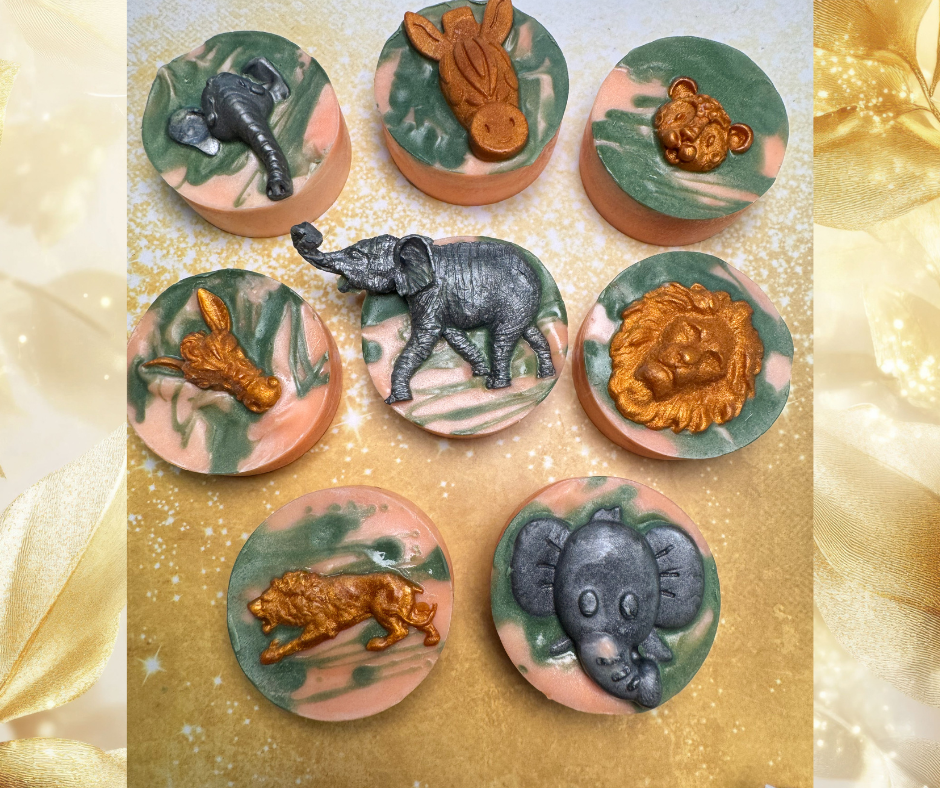 Ingredients: Olive Oil, Organic Coconut Oil, Safflower Oil, Cocoa Butter, Distilled Water, Organic Shea Butter, *Sodium Hydroxide, Castor Oil, Sodium Lactate (fermented sugar), White Kaolin Clay, Phthalate-Free Fragrances, Vegan & Cruelty Free Colorants, & Safari Vibes!